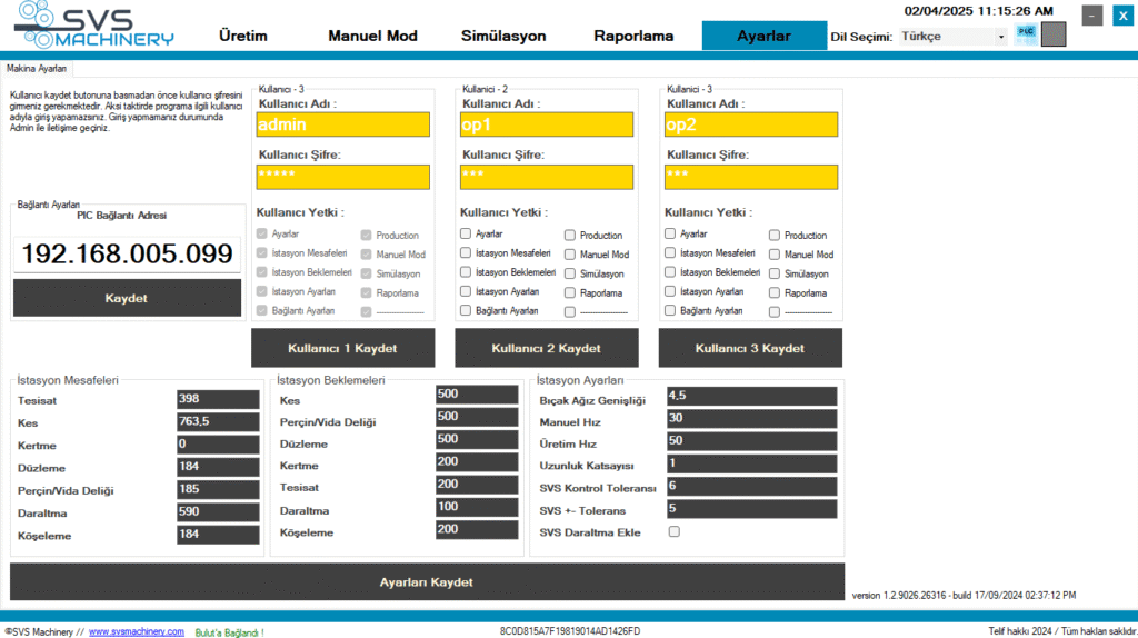 Ayarlar sekmesinde, çoklu kullanıcı tanımlanarak operatörlerin erişim ve işlem yetkileri sınırlandırılabilir.