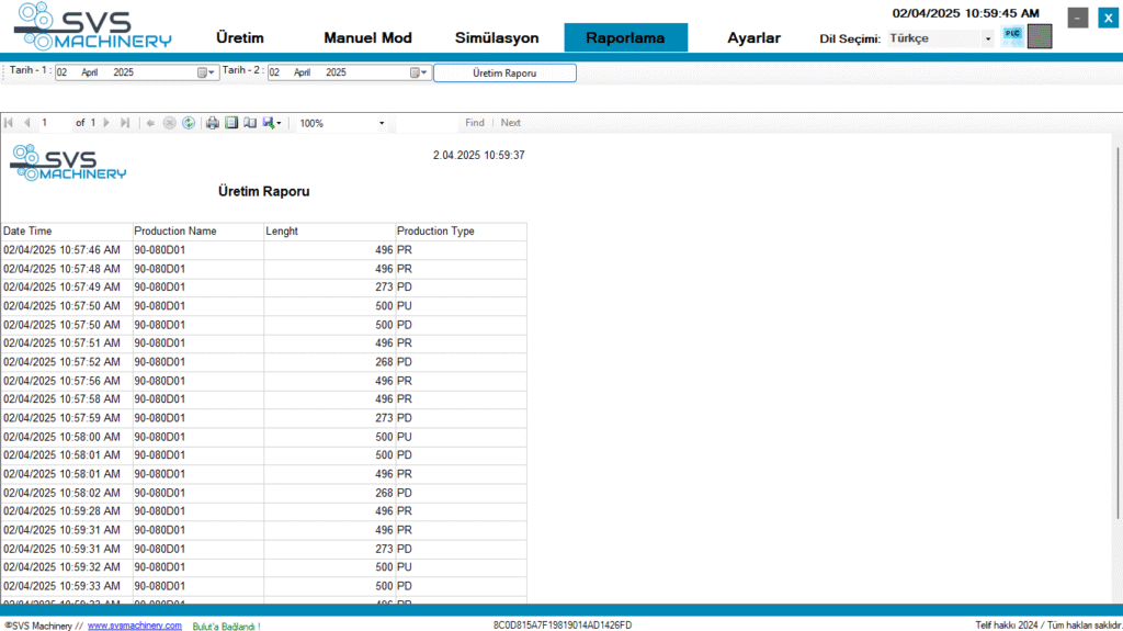 Raporlama sekmesinde; verimlilik, maliyet ve üretim miktarları gibi veriler izlenebilir ve PDF, EXCEL,WORD formatlarında raporlanarak dışarı çıkartılabilir.